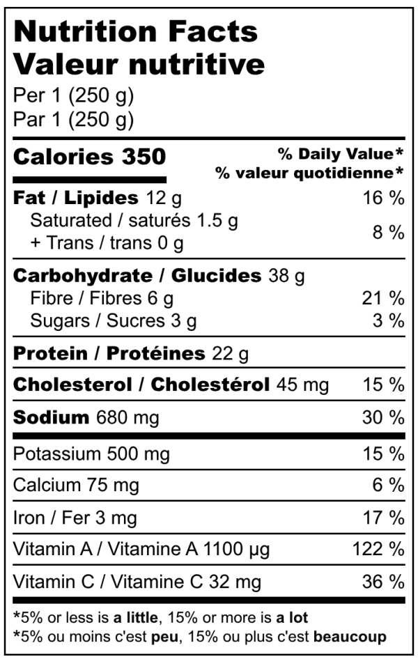 350 CALORIES, 22G PROTEIN, 6G FIBER AND A GOOD SOURCE OF VITAMIN A AND VITAMIN C.